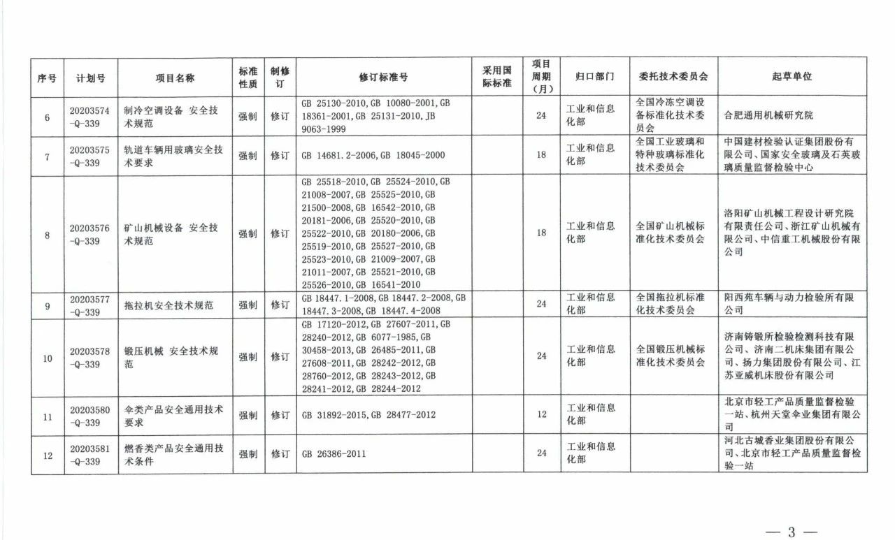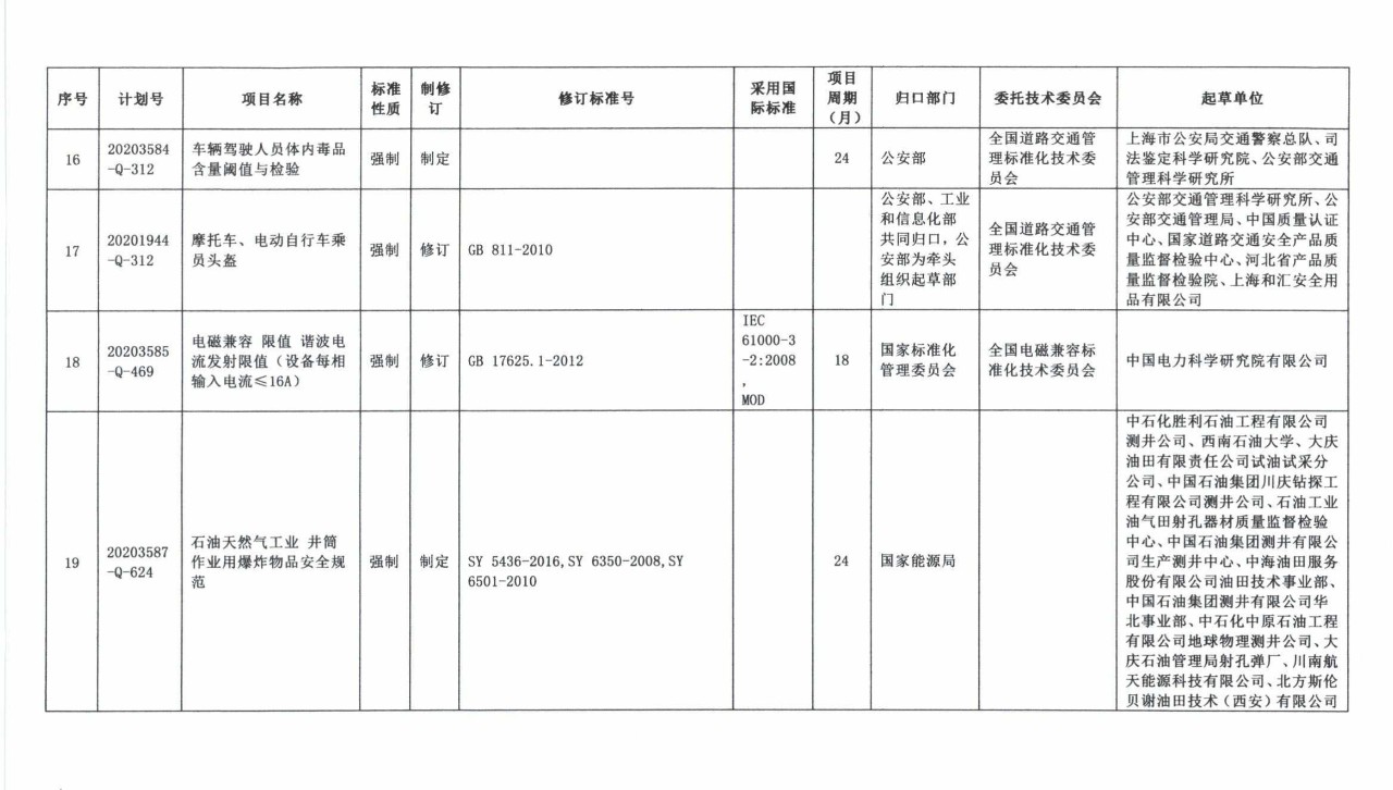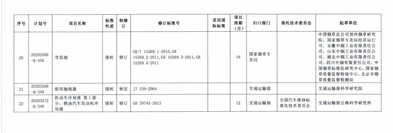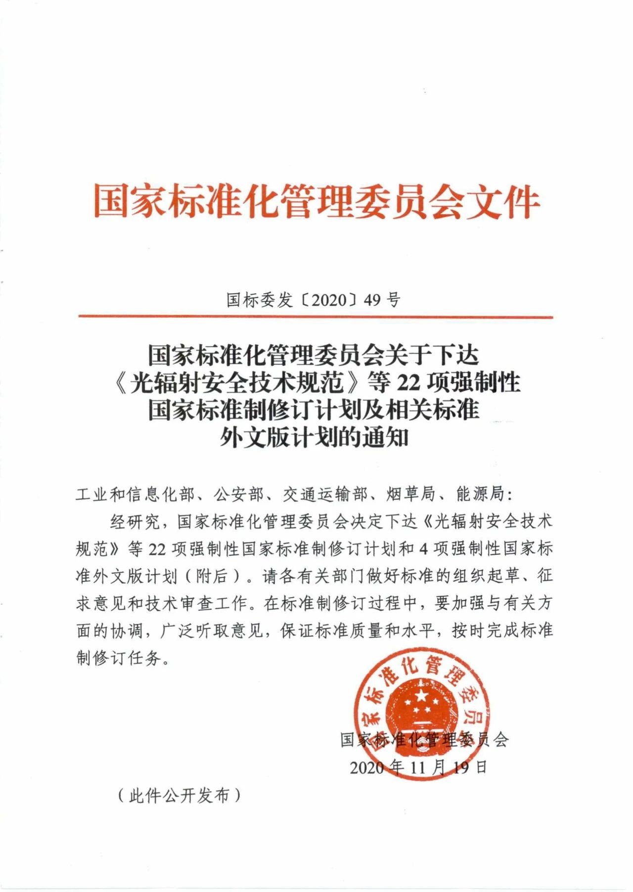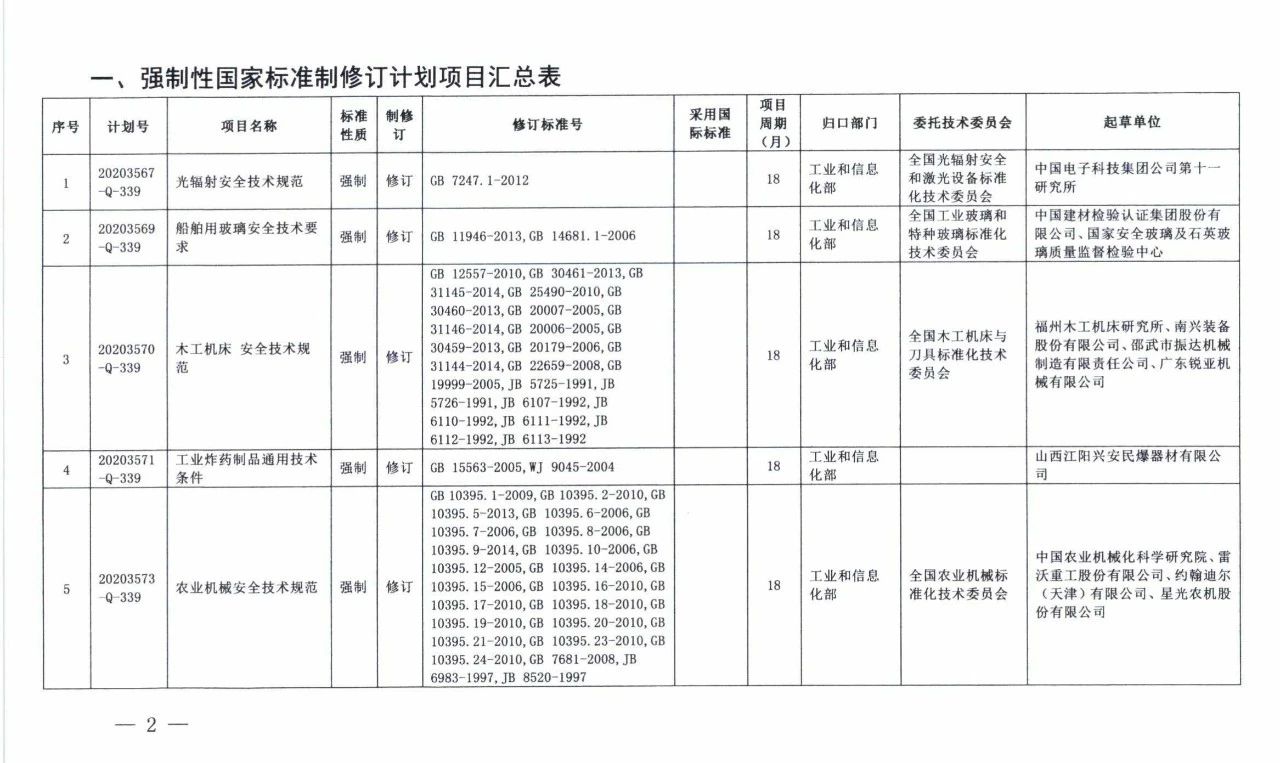 日前,国家标准委向工信部、公安部、交通运输部、烟草局、水电局等单位下达了《光辐射安全技术规范》等22项强制性国家标准制修订计划和4项强制性国家标准外文版计划。具体内容如下: