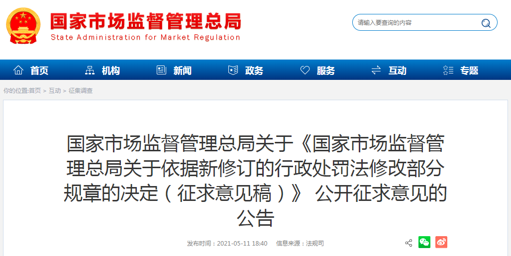 为保障新修订行政处罚法的贯彻实施,市场监督管理总局研究起草了《国家市场监督管理总局关于依据新修订的行政处罚法修改部分规章的决定(征求意见稿)》,现向社会公开征求意见。涉及《市场监督管理行政处罚程序暂行规定》、《市场监督管理行政处罚听证暂行办法》2件部门规章。