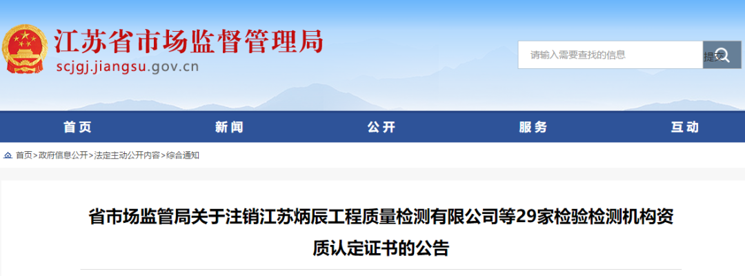 江苏省市场监管局关于注销江苏炳辰工程质量验收有限公司等29家检验验收机构资质认定证书的公告