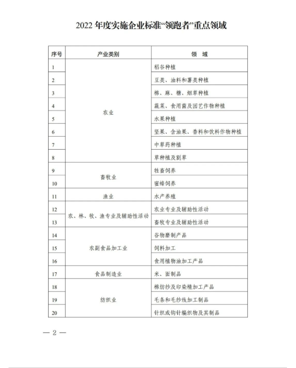 为贯彻落实《国家标准化发展纲要》《“十四五”市场监管现代化规划》等要求,依据《市场监管总局等八部门关于实施企业标准“领跑者”制度的意见》,市场监管总局会同国务院有关部门,围绕国家重大决策部署,聚焦行业高质量发展,统筹考虑企业标准自我声明公开情况、消费者关注程度、标准对产品和服务质量提升效果,研究制定了《2022年度实施企业标准“领跑者”重点领域》,现予以公告。