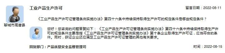 近期,有网友在市场监管总局网站公众留言系统咨询“工业产品生产许可”方面相关问题,市场监管总局产品质量安全监督管理司给予了答复。