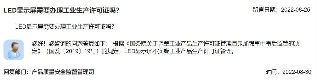 您好!您咨询的问题答复如下:根据《国务院关于调整工业产品生产许可证管理目录加强事中事后监管的决定》(国发〔2019〕19号)的规定,LED显示屏不实施工业产品生产许可证管理。