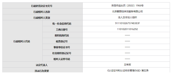 北京市市场监管局网站近日公布的处罚信息(京西市监处罚〔2022〕1966号)显示,北京靓丽佳保洁服务有限公司因违反《认证证书和认证标志管理办法》第五条,被北京市西城区市场监督管理局罚款3万元。