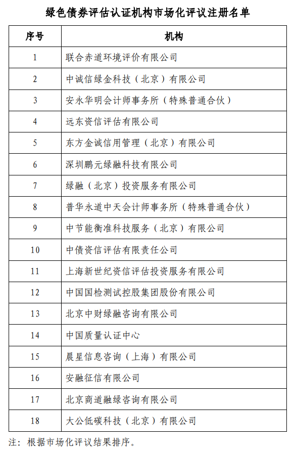 结果显示,联合赤道环境评价有限公司、中诚信绿金科技(北京)有限公司、安永华明会计师事务、远东资信评估有限公司、东方金诚信用管理(北京)有限公司、普华永道中天会计师事务所、中国质量认证中心等18家机构获注册。