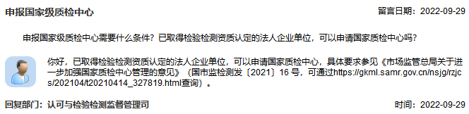 近期,有网友在市场监管总局网站公众留言系统咨询“申报国家级质检中心需要什么条件?”,市场监管总局认可与检验验收监督管理司给予了答复。
